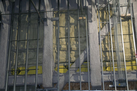 3.5” Staycell ONE STEP® 502 intumescent spray foam insulation was applied to all interior surfaces of the wall assemblies consisting of 6” pre-cast concrete panels covered on the exterior with 2” granite and marble veneer. Prior to application, PSI conducted a WUFI analysis (hygro-thermal building modeling program used to predict moisture and thermal transport in building envelope systems over a period of time) to confirm thickness and performance.